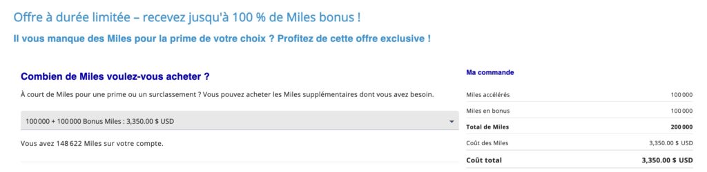 Notez bien : cette promotion est récurrente et fréquente. Air France offre des primes sur l’achat de Miles Flying Blue plusieurs fois par année. Ceci peut consister à un rabais à l’achat de Miles ou des Miles en boni.