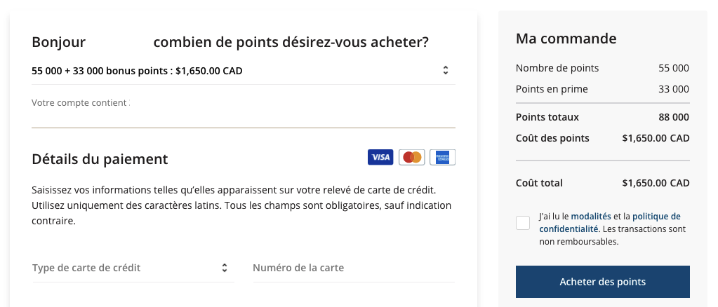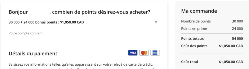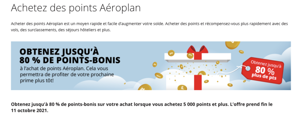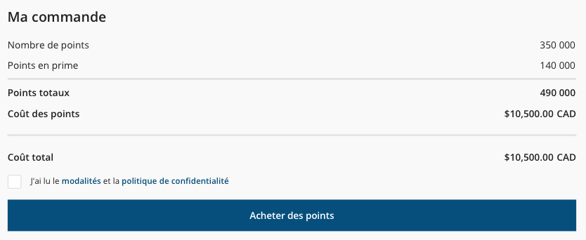 L’achat de points-bonis Aéroplan n’est pas considéré comme un achat sur le site d’Air Canada ou d’Aéroplan. Il n’y a donc pas de points supplémentaires par dollar avec l’une des cartes de crédit Aéroplan.