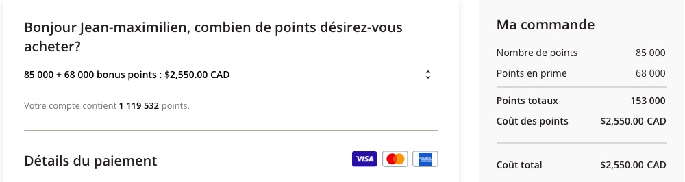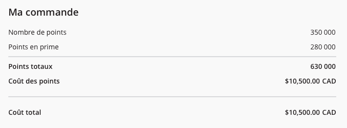 3. Choisir la quantité de points désirée (le nombre maximal de points que vous pouvez acheter est plafonné à 1 000 000 par année civile) ;