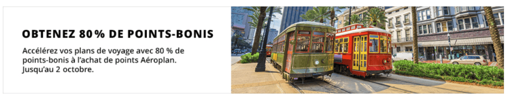 Il vous manque des points Aéroplan pour réserver votre billet d’avion presque gratuit? Profitez de cette promotion d’achat de points Aéroplan, qui vous permet d’obtenir jusqu’à 100 % de points-bonis.