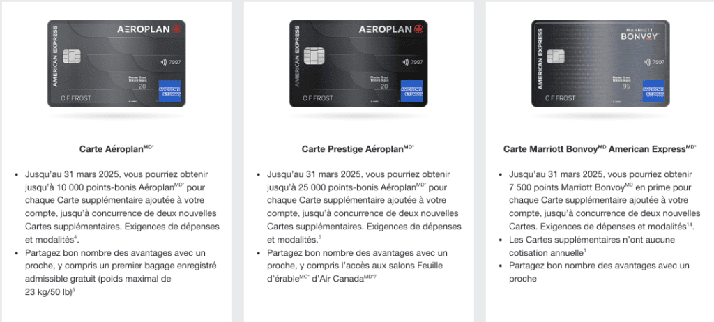 Cette promotion est actuellement en cours pour les cartes personnelles seulement et se poursuit jusqu’au 30 octobre 2025. Étant donné que certaines cartes supplémentaires n’ont pas de frais, cette offre peut être très avantageuse si les titulaires de la carte supplémentaire optimisent les accélérateurs de points au maximum.