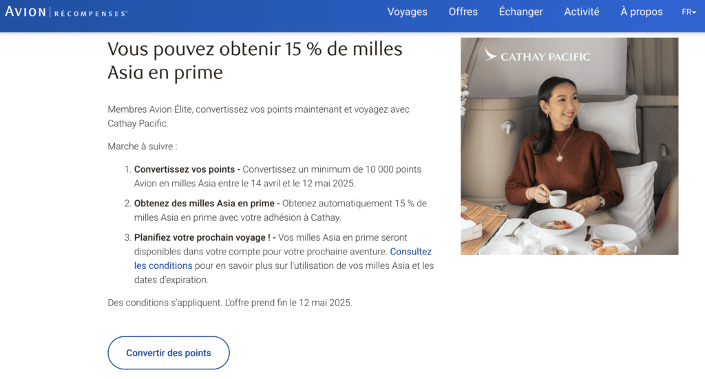 Cette promotion est offerte par RBC Avion Récompenses. Vous ne verrez donc aucun signe de celle-ci du côté de Cathay Pacific, ni sur Asia Miles, mais elle sera sur la page Voyages de RBC Avion Récompenses.