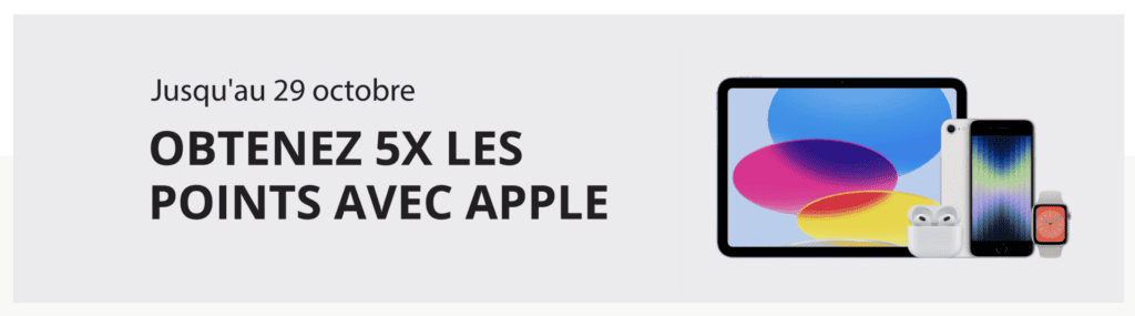 Par exemple, si vous achetez un produit Apple de 1 000 $, vous accumulerez 5 000 points Aéroplan (1 000 x 5).