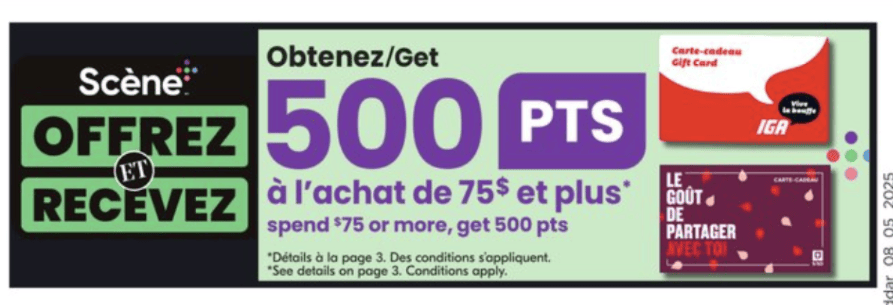 Lisez bien toutes les modalités associées aux offres sur le site ou l’application mobile de Scène+/IGA. Certaines offres nécessitent une activation préalable ou un coupon.