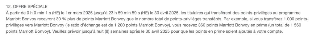 Les points bonis sont versés lorsque le transfert est complété. Par conséquent, il est normal de voir seulement le taux de 1 000 points-privilèges = 1 200 point Marriott Bonvoy au moment de faire l’échange sur le site d’American Express.
