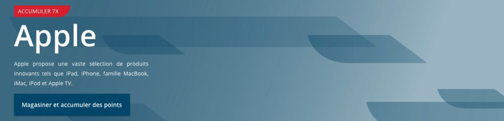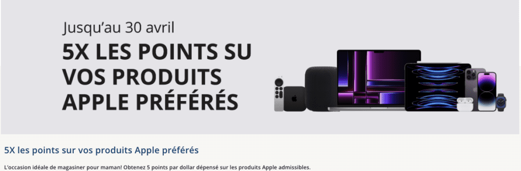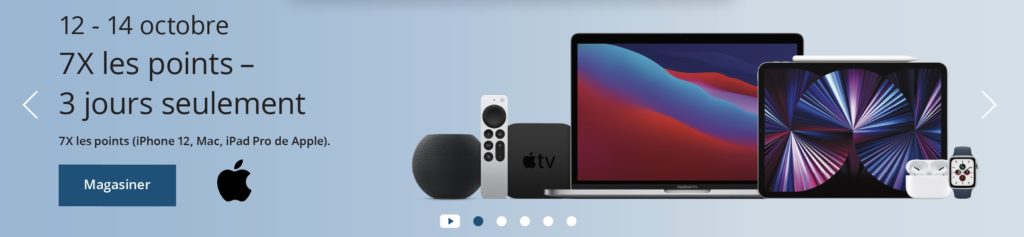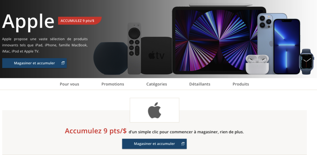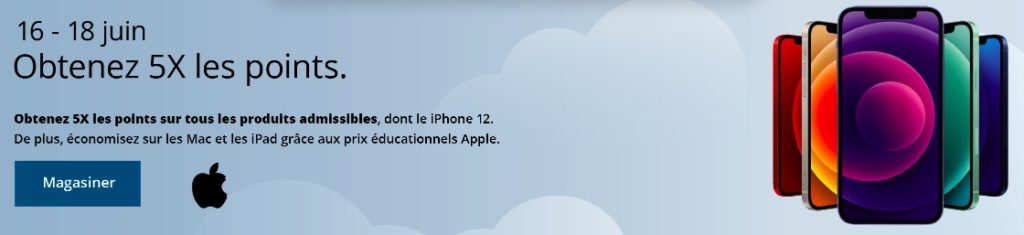 Par exemple, si vous achetez un produit Apple de 1 000 $, vous accumulerez 5 000 points Aéroplan (1 000 x 5).