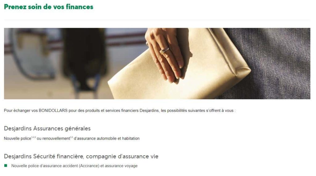 Bref, vous l’aurez compris: vous pouvez quasiment tout faire avec vos BONIDOLLARS sur l’aspect produits et services financiers de Desjardins. C’est une bonne manière d’utiliser vos BONIDOLLARS si vous n’avez aucun voyage de prévu !